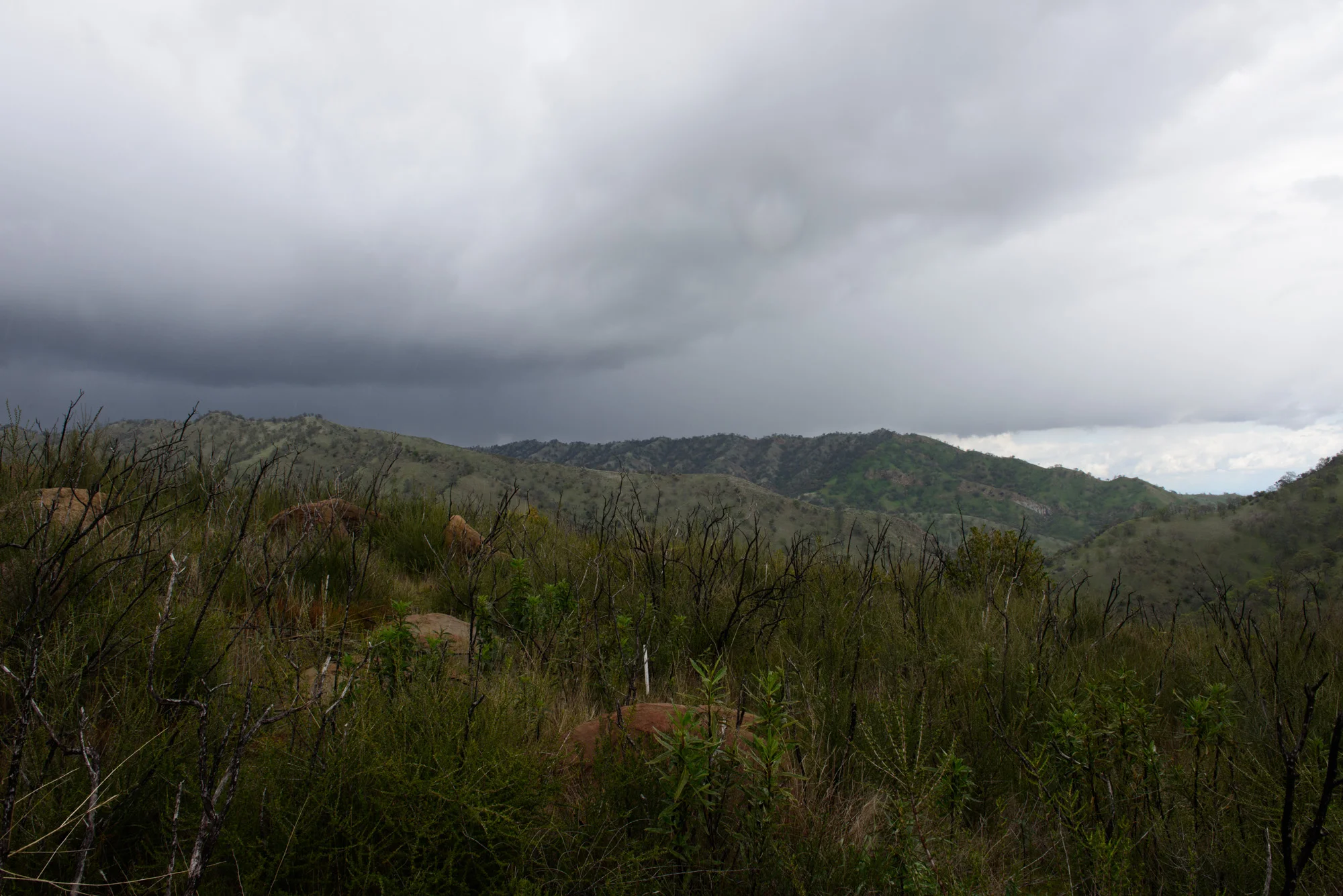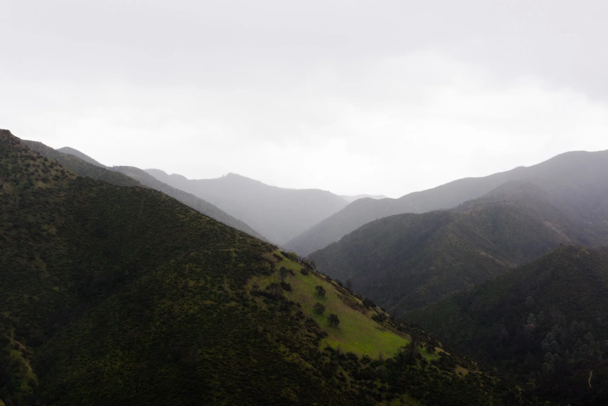 The rain was coming down pretty hard when I snapped this photo. The result was decreased clarity; the ridge lines appear as outlines, each with their own shade.