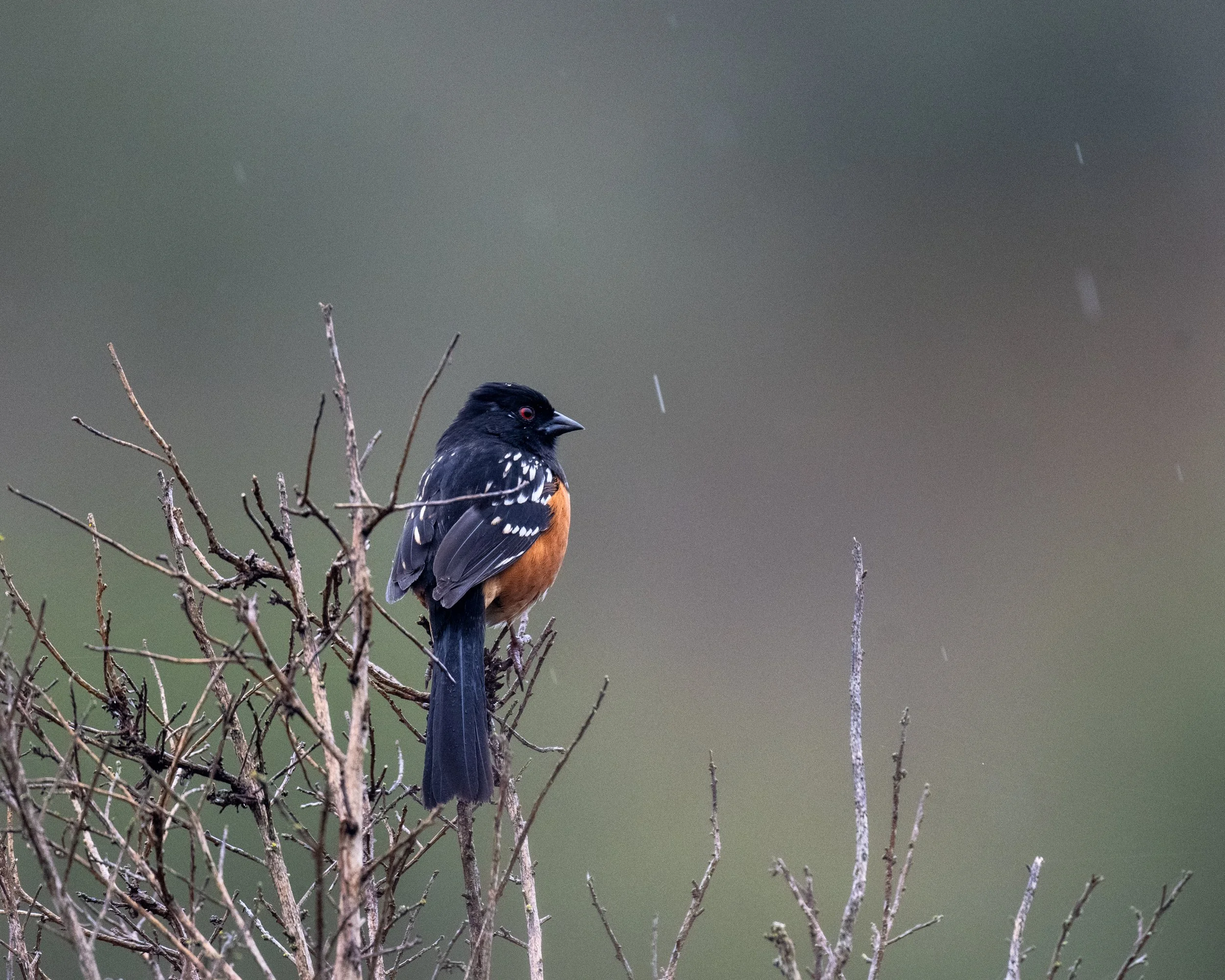 The calls of Spotted Towhees make up a big piece of the soundtrack nearly every time I go for a walk in the East Bay hills. But they can be hard to see (clearly) because they forage by scraping the ground to find insects under the protection of dense shrubs. It was a treat to see this one on a prominent perch in the rain.