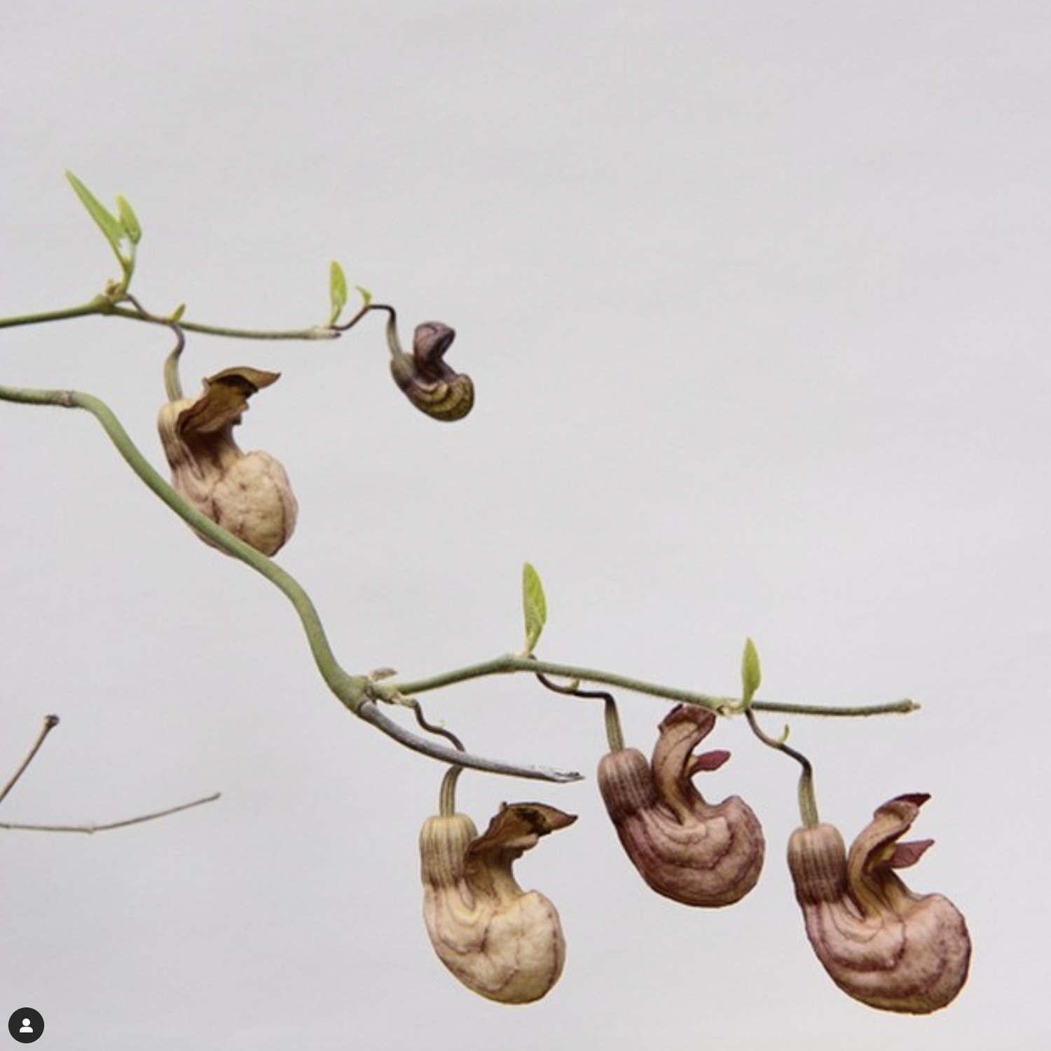 The pipe-shaped veined flower of the California pipevine with its open mouth and bumpy blush-colored lips is not actually carnivorous, though its carrion-like smell draws in flies which are trapped inside, then released once pollination is complete, a gentle form of plant trickery.