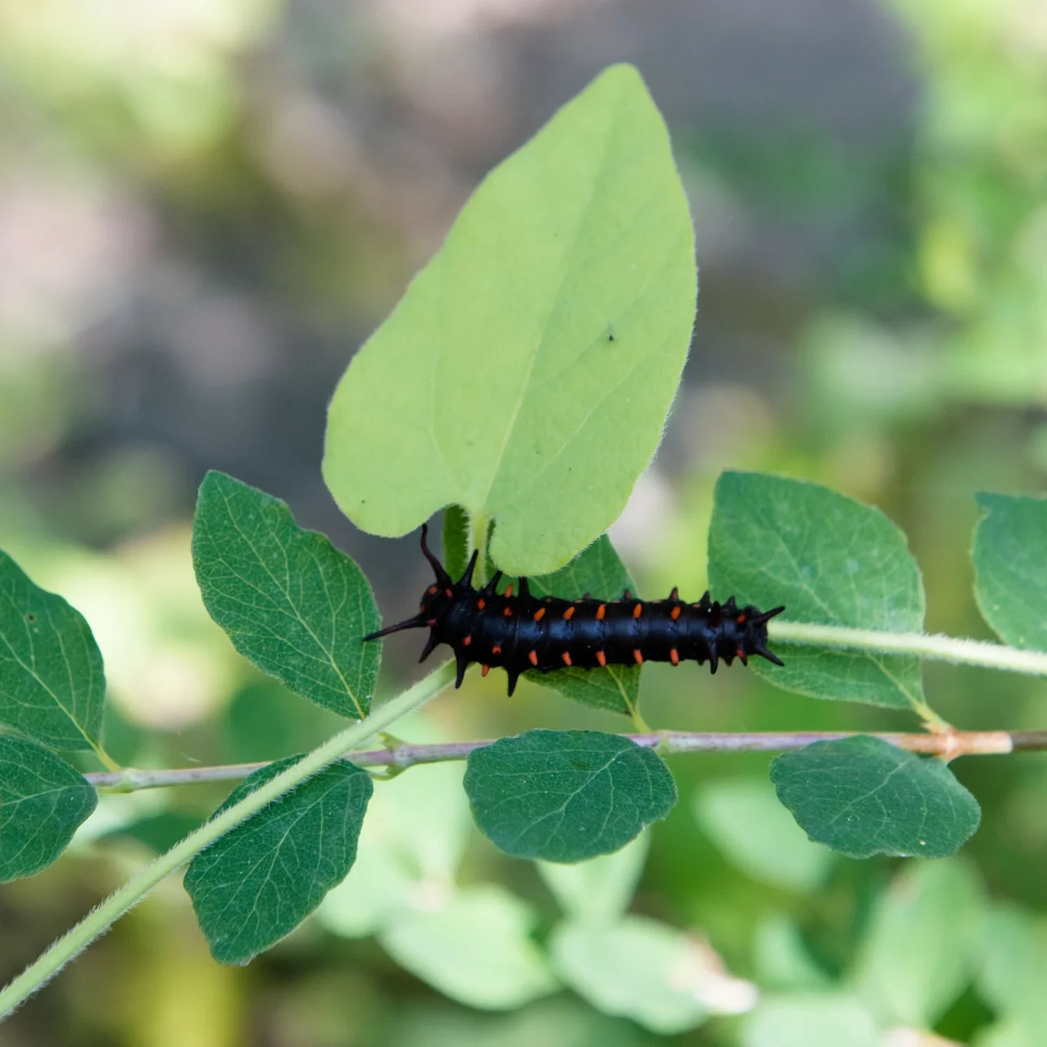 Pipevine swallowtail butterfly caterpillar at Regional Parks Botanic Garden (pipevine leaf in the single center leaf)