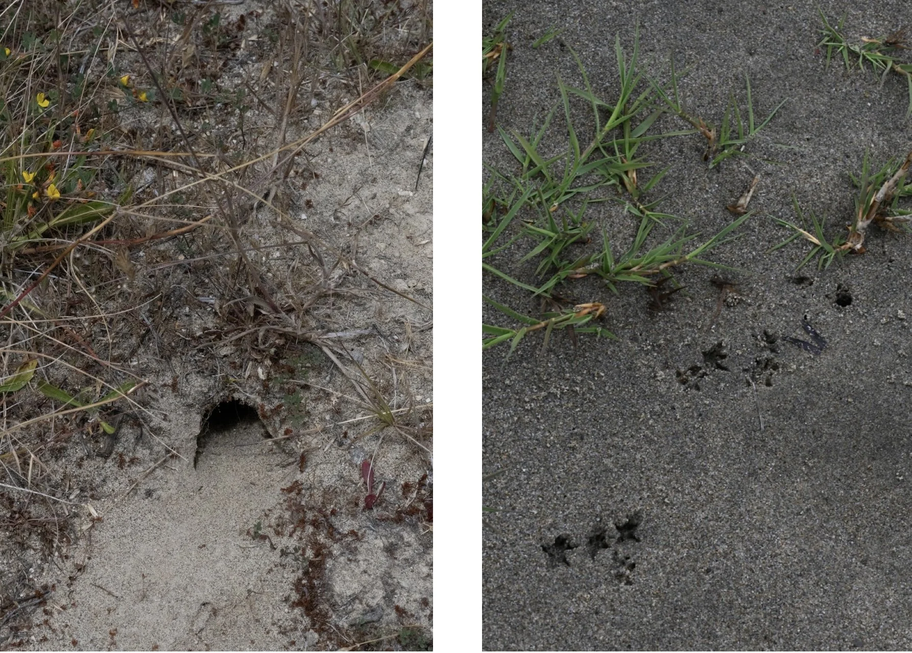 A probable mouse burrow (left) and mouse tracks in wet sand (right)