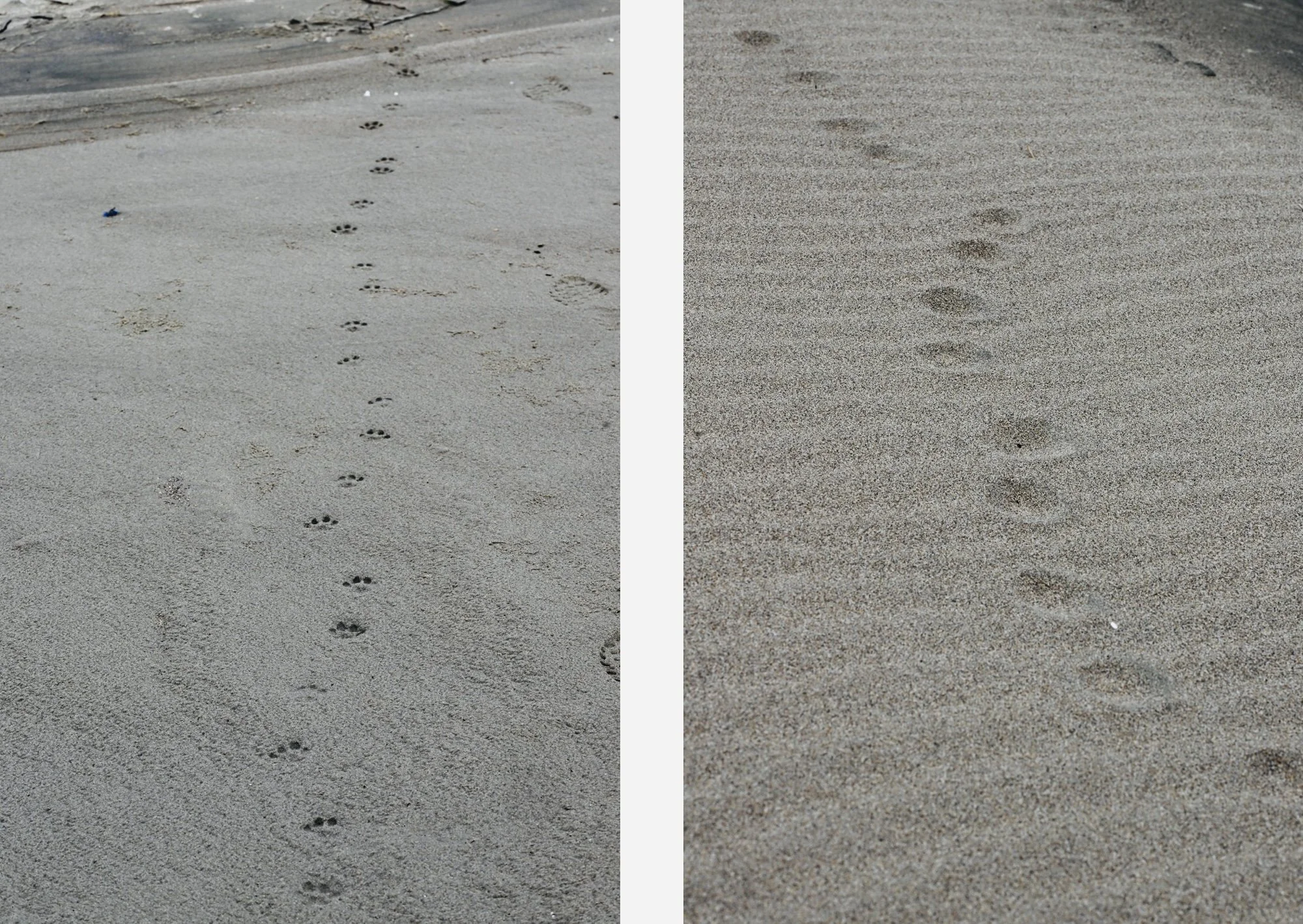 The same set of bobcat tracks on wet sand (left) versus dry sand (right)
