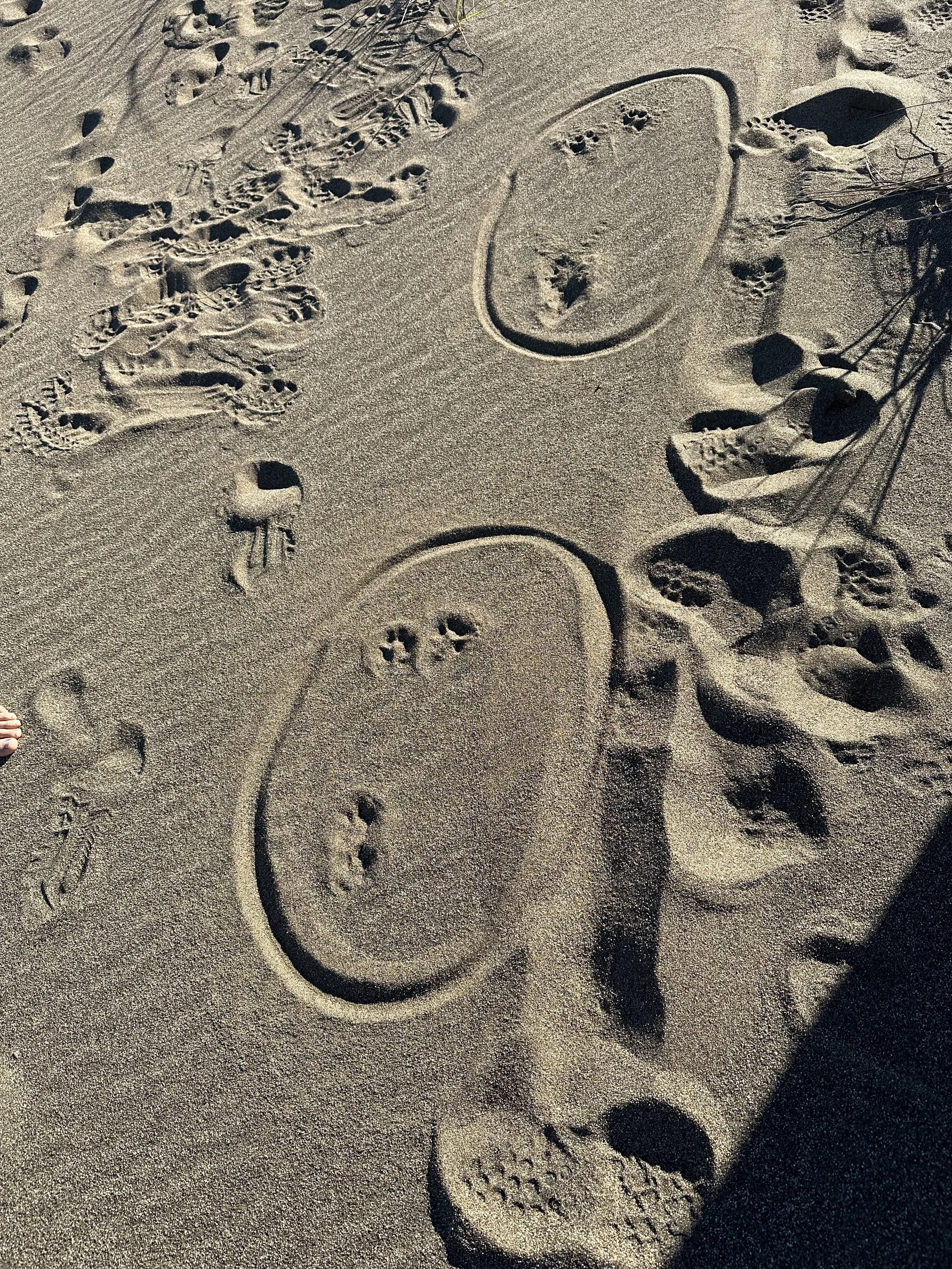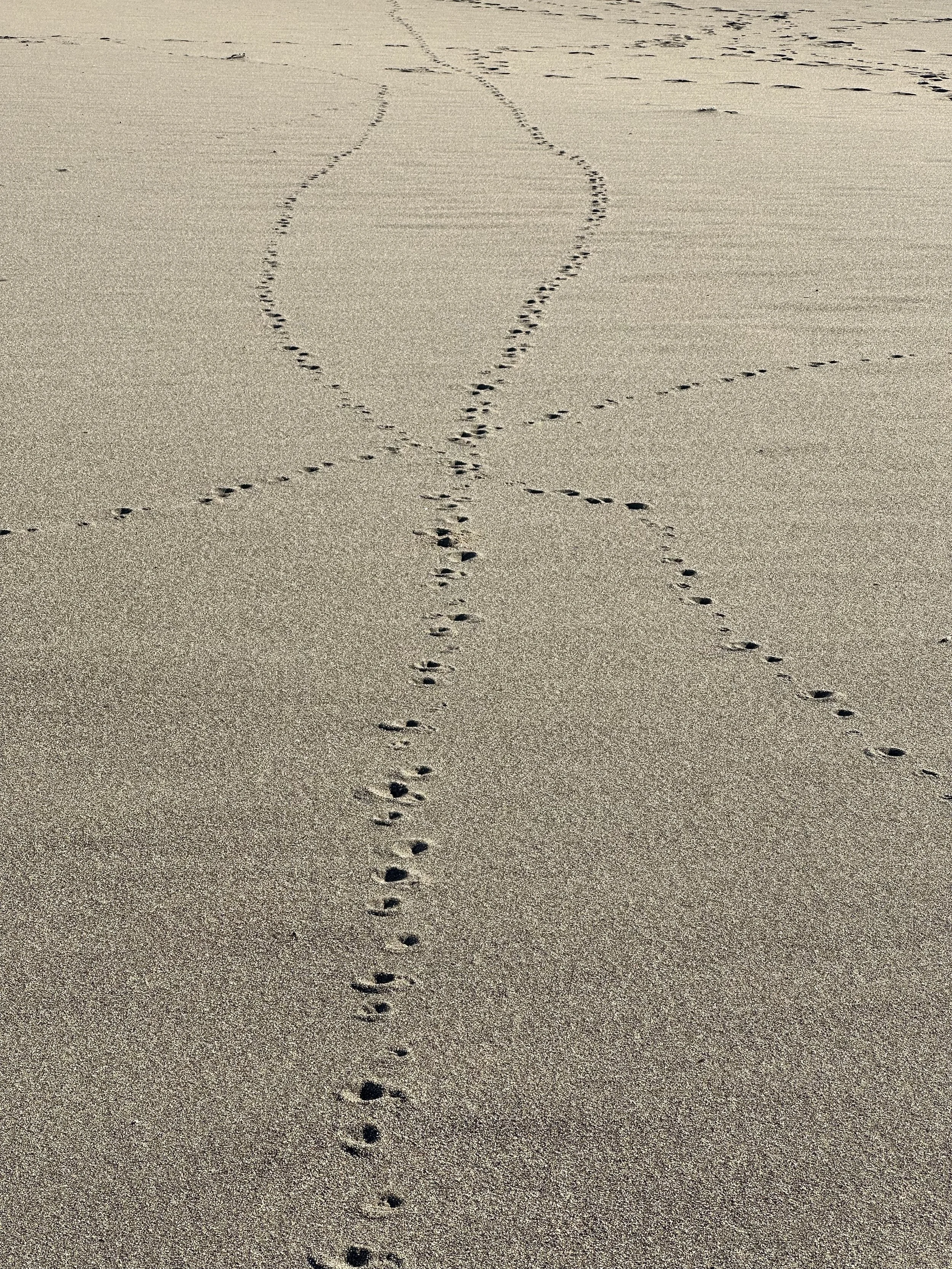 I went to Kehoe Beach yesterday because the tide was right and I figured there would've been coyotes in the pre-dawn, scavenging along the high tide line. I figured we’d have time to find some good clean trails, that was my goal. And we did! You can tell right and left prints even if you don't have the rest of the track. You can tell by those slender, long, kinda sharp, toenails that coyotes have. The two middle toenails slightly bend toward each other, and the nail on the middle toe (between index finger and ring finger) is just slightly longer. It's the same as our hand. We still have the same morphology as all these other animals. That foot and hand is this universal shape and the way it falls off from the middle toe. That's a consistent thing in their tracks. That's the thing that takes it out of just pure memorization. For me it's when I understand why something is that way, then I don't need to remember it anymore.