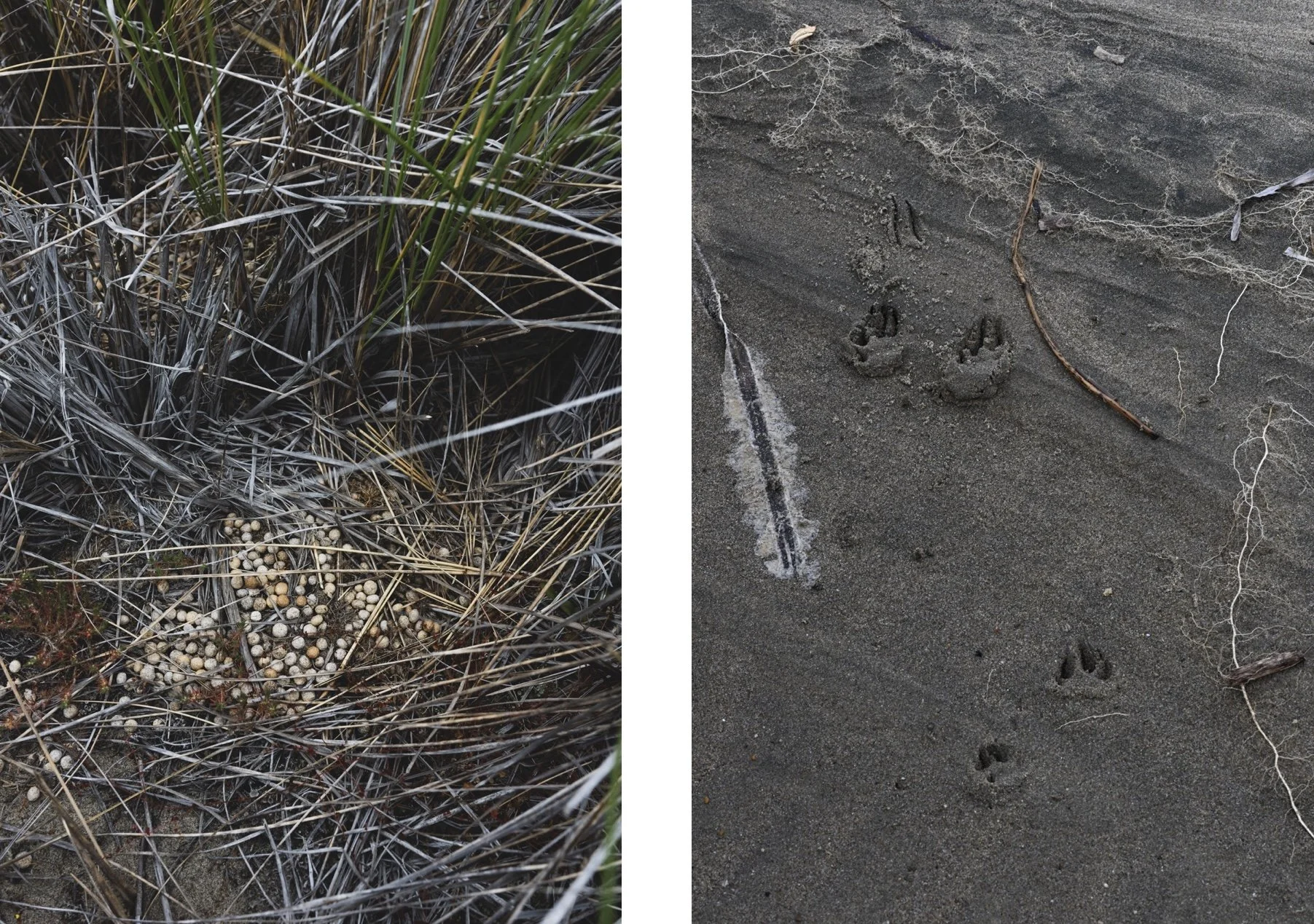Brush rabbit scat (left) and rabbit tracks going up an incline on wet sand (right)